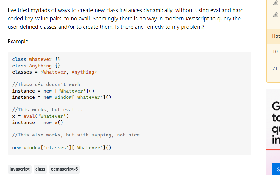 First of all, we can see that the question lacks effective netiquette because it fails to demonstrate respect for the community’s time and resources, which is not good for him to get the answer, The question about dynamically creating class instances in JavaScript without using eval is less effective due to its lack of clarity and focus. The user said he’ve tried many times but did not explain why they were all failed or what specific issues were encountered, this makes other users difficult to analyze the problem, resulting in a 0 reply on his question.