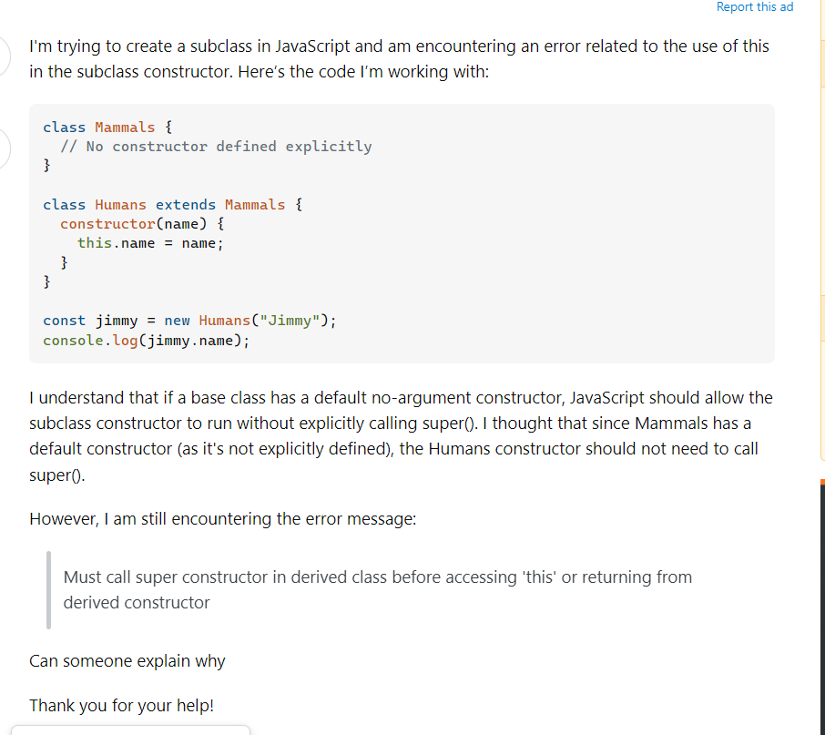 https://stackoverflow.com/questions/78800907/why-am-i-getting-compile-error-in-javascript-when-extending-a-class-with-a-defau, this question was asked in Stack overflow, the largest community for developers in the world, in this question, the author wanted to know why there was a compile error when extending a class with a default constructor in JavaScript, first of all, his question has a clear problem: Why the compile error occured in this case? Other members in the community can see his code attached, which can make it easier to solve the issue, the problem was explained clearly and he also attached the error message: Must call super constructor in derived class before accessing ‘this’ or returning from derived constructor, all relevant details are given so I think he created a good scenario that other users can offer assistance easily, he also said thank you at the end, which is respectful, so it should be considered as a good example of SMART questions, we can see that another user helped him fix the issue in a short time.
